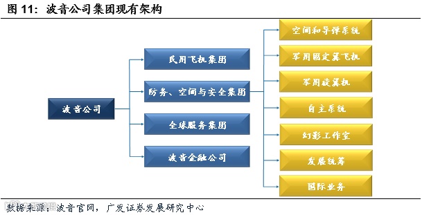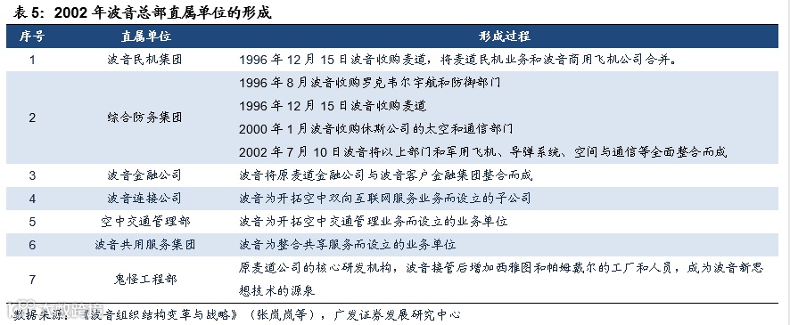 重组集团架构,转向军民结合发展模式。20世纪90年代,波音公司包括民机集团、防务系统集团、航天与通信集团三大分公司。航天与通信集团下设空间系统部、信息与通信部、研究发展部三大事业部。为了从以民机销售为主的盈利模式向军民结合的盈利模式转变,波音对外并购并对集团架构重组,以提升军民分块业务的管理效率;随后在2012-2013年对防务、空间和安全业务大规模整合,以适应发展策略。