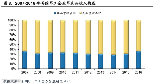 军民融合成效显著,军民品结构协调。据SIPRI统计数据, 2016年美国军工企业军品收入占其总收入比例为35.7%,而民品收入占比64.3%;2007年以来,美国主要军工企业的民品总收入占比超过60%,民品收入成为军工企业的重要收入支撑,体现出明显的军民融合效果。