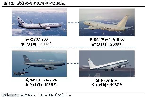 改装生产线,军民飞机同线总装。为满足军用飞机的需要,波音对民航飞机生产线进行改装,使得军机制造时的局部微调更为便捷,也可增加工位来装配机载设备。这种方式平衡了民航飞机批量生产和军用飞机定制化生产的矛盾,波音向美国海军交付的P-8A“海神”飞机和波音737-800客机来自同一生产线。相应地,成熟的军用飞机也可改装成民用客机,如波音707飞机就是美国大型加油机KC-135的衍生型号,在零部件生产、研发中采用了大量的军机技术。