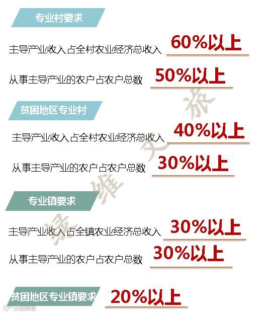 (一)主导产业突出。专业村主导产业收入占全村农业经济总收入60%以上,从事主导产业的农户占农户总数50%以上,贫困地区可分别放宽到40%和30%以上。专业镇主导产业收入占全镇农业经济总收入30%以上,从事主导产业的农户占农户总数30%以上,贫困地区可放宽到20%以上。