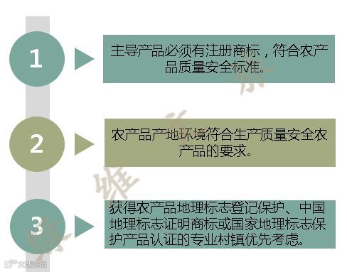 (二)实现绿色发展。主导产品必须有注册商标,符合农产品质量安全标准。农产品产地环境符合生产质量安全农产品的要求。获得农产品地理标志登记保护、中国地理标志证明商标或国家地理标志保护产品认证的专业村镇优先考虑。