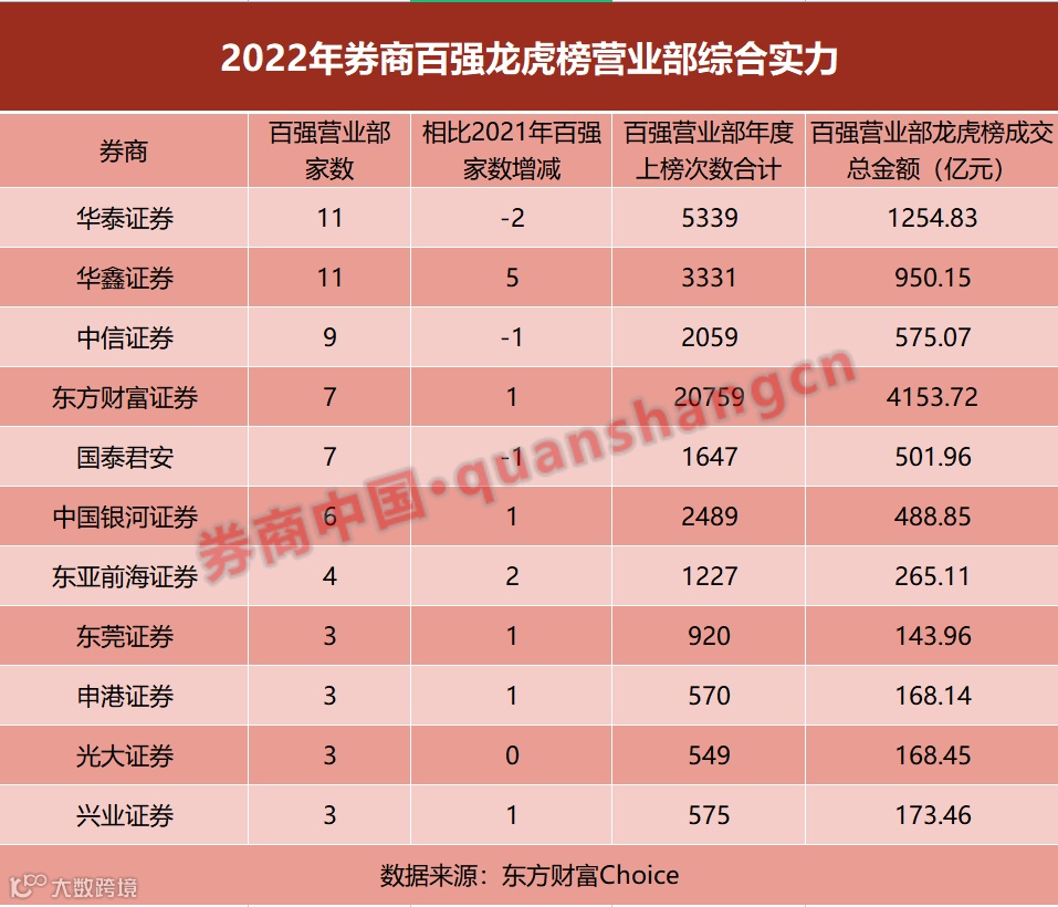 从券商龙虎榜营业部综合实力来看,华泰证券、华鑫证券、中信证券百强营业部家数排名居于前三,分别为11家、11家、9家。