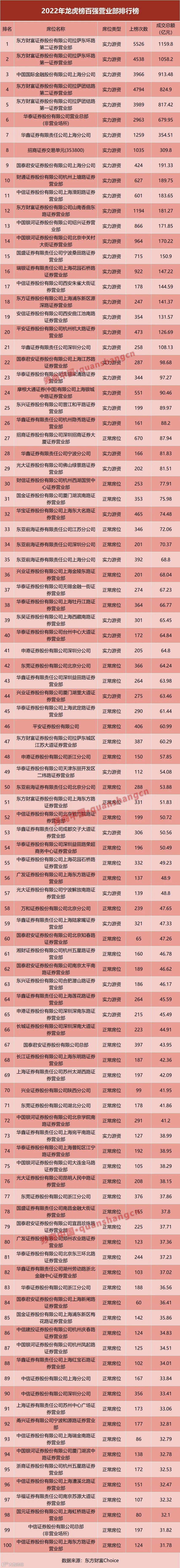 中金公司进入百强榜的家数则有所下降,2021年中金公司及旗下中金财富证券合计有5家营业部上榜,而2022年仅中金公司上海分公司这1个席位进入百强。
