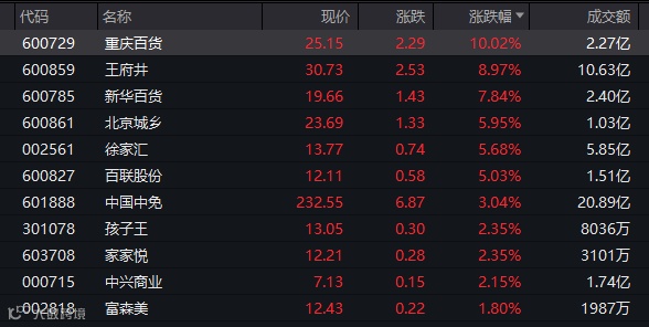 具体行业板块来看,若按照申万一级行业划分,商贸零售板块领涨,板块内重庆百货盘中涨停。王府井、新华百货、徐家汇等多股纷纷大涨。