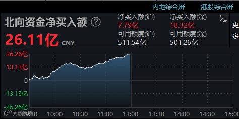北向资金继续净买入,上午半个交易日净买入额达到26.11亿元。