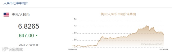 另据中国外汇交易中心数据显示,1月9日人民币兑美元中间价报6.8265,较上一交易日上调647点。