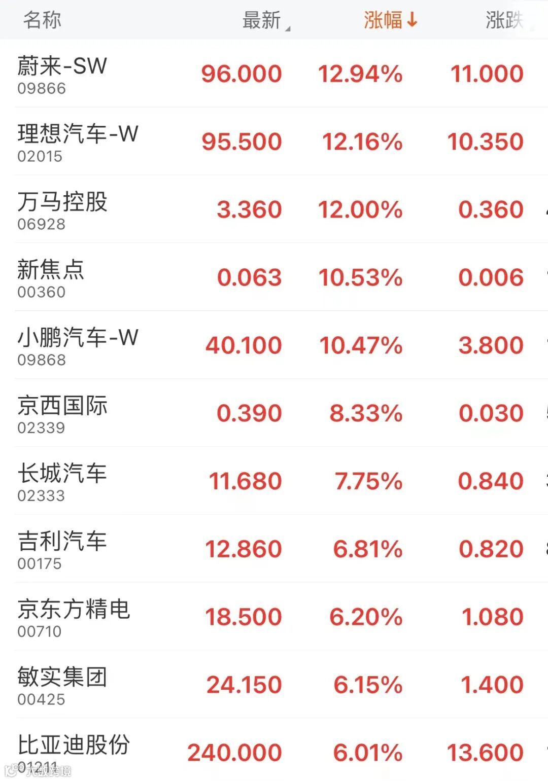 港股汽车板块集体走强,截至收盘,蔚来-SW涨12.94%、理想汽车-W涨12.16%、小鹏汽车-W涨10.47%、长城汽车涨7.75%、比亚迪股份涨6.01%。