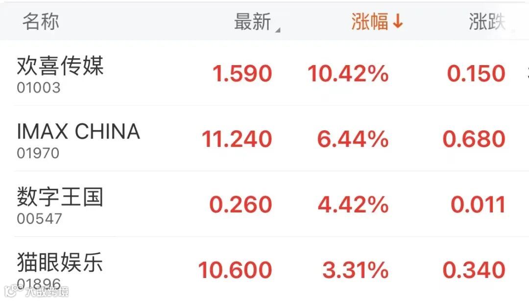 1月26日,港股影视股集体走强,早盘时欢喜传媒一度涨近30%,IMAX中国一度涨超10%。截至收盘,欢喜传媒涨10.42%、IMAX中国涨6.44%、数字王国涨4.42%、猫眼娱乐涨3.31%。