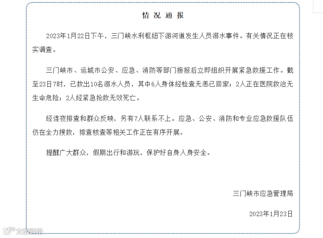 23日,“湖滨发布”通报称,截至23日7时,2人经紧急抢救无效死亡,另有7人联系不上。参与救援的山西省平陆县应急管理局负责人表示,事发后平陆县和河南三门峡市湖滨区的多部门都参与了救援工作,截至23日7时,已救出10名溺水人员,其中6人身体经检查无恙已回家;2人正在医院救治无生命危险;2人经紧急抢救无效死亡。
