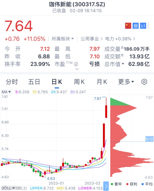 二级市场上,珈伟新能连续三日股价大涨,累计涨幅超过40%。2月9日,该股收报7.64元,涨幅11.05%,总市值62.98亿元。