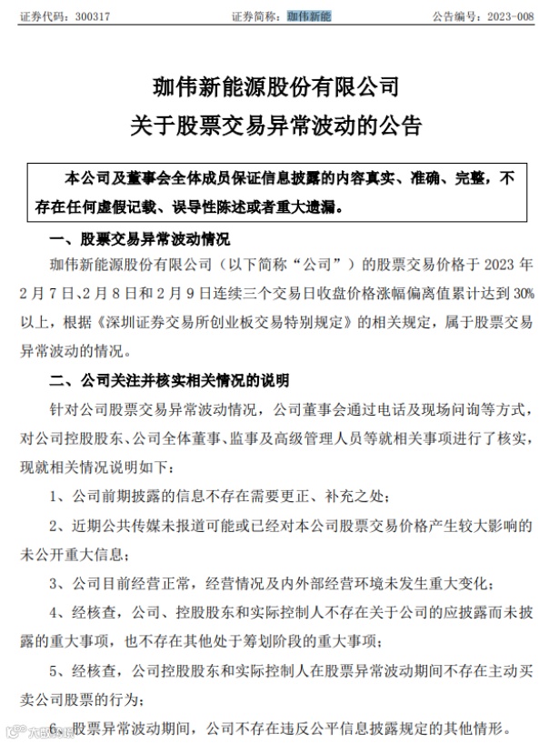 珈伟新能2月9日晚间发布股票交易异常波动公告称,公司的股票交易价格于2023年2月7日、8日和9日连续三个交易日收盘价格涨幅偏离值累计达到30%以上,根据《深圳证券交易所创业板交易特别规定》的相关规定,属于股票交易异常波动的情况。