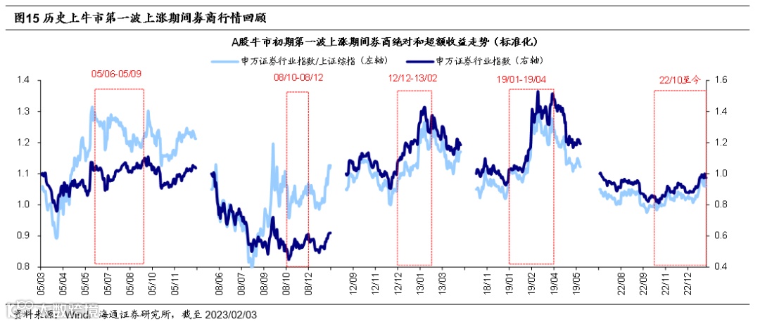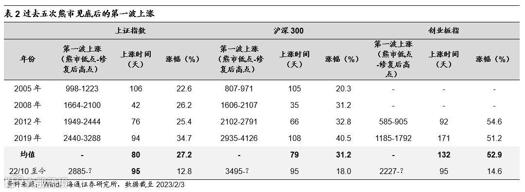 本次内资望接力,助推牛市初期第一波上涨。综上所述,借鉴2018年末2019年初行情,随着本轮上涨行情的展开,后续来自内资的增量有望持续入场。我们在《股市前“兔”似锦-20230128》中分析过,本轮2022年10月底以来的上涨行情性质属于牛市初期的第一波上涨,从牛熊周期、估值、基本面、资金面等维度来看,A股底部已过,目前正步入牛市初期的向上通道。对比历史四次牛市初期的第一波上涨,宽基指数涨幅30%附近,时间平均持续3-4个月(详见表2),而2022年10月底至今(截至2023/02/03,下同)上证综指涨幅13%、沪深300涨18%,上涨持续约3个月,上涨时空相较历史尚有差距。此外从季节性规律的视角看,历史上A股往往在岁末年初迎来春季行情,启动时间早晚往往与上年三四季度行情有关,由于2022年7月-10月A股表现较弱,因此这次春季行情自2022年10月底开始启动。从涨幅看,历次春季行情指数涨幅大多超20%,而本次行情涨幅尚不及历史。