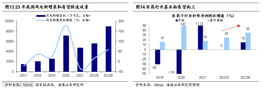 消费方面,目前促消费同样是政策的重点,未来疫情扰动渐去叠加政策支持有望推动消费基本面改善。结合估值和盈利修复匹配程度,我们认为短期看传统零售或纺织服装还有修复空间,当前餐饮、酒店、景区演艺等受益于强复苏预期,估值先于基本面修复,但后续需通过高频数据追踪以验证需求复苏程度。此外,低估低配的医药也有望迎来基本面改善,短期来看,当前疫情影响仍在持续,新冠防疫产品和抗感冒药物需求旺盛。展望2023年,借鉴2021年疫后复苏经验,器械、医疗服务、中药有望增长较快。