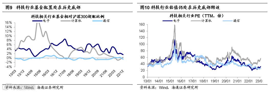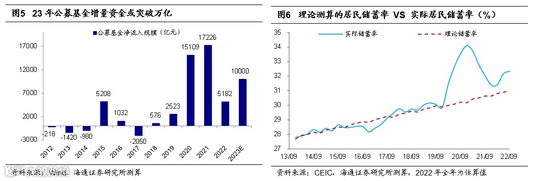 因此综合来看,2022年10月底以来的牛市第一波上涨或尚未走完,尽管短期内市场的走势可能出现波折,但并不会改变市场中长期向上趋势。随着市场行情进一步向上,我们认为公募基金有望成为推动内资增量入场的重要来源。2022年底时我国居民存款增速已抬升至17.3%,同比多增7.9万亿,据海通宏观测算,其中约3万亿为居民的超额储蓄。我们认为随着疫情扰动渐去,叠加A股已经进入上行通道,资本市场有望成为居民超额储蓄的流动重要方向。中长期看,居民资产配置向权益转移趋势进一步延续,内资有望持续入市,我们预计2023年公募资金净流入A股市场规模或突破1万亿元。