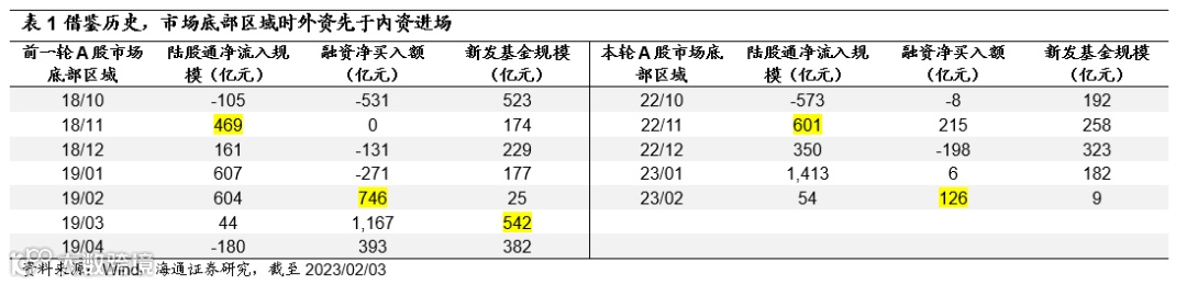 借鉴2018年末2019年初行情,外资在市场底部进场,而内资后续接力。相比外资,在本轮A股的上涨行情中,内资表现相对谨慎,2022/11以来杠杆资金仅净流入约150亿元左右,2022/11-2023/01期间公募基金每月的总计新发规模也仅在200-300亿元左右,并未明显放量。前期行情火热背景下内资仍偏谨慎,那么后续内资还会进场么?其实,借鉴上一轮牛熊周期起点,即2018年底至2019年初期间的行情,可以发现当时A股的市场底出现在2019/01,而外资则从2018年11月时就已开始明显流入A股市场,当时外资情绪得到提振,主要源自于积极政策的持续出台缓解市场担忧,例如2018年11月习总书记在民营企业座谈会上提出大力支持民营企业发展壮大,2018年12月中央经济工作会议提出要强化逆周期调节。再看内资,与当前情况类似,彼时的内资入场节奏同样偏缓,杠杆资金在2019/01时仍净流出271亿元,直至19/02才转向大幅流入,公募基金发行则等到2019/03才开始放量。