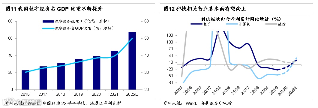 成长中重视数字经济。具体行业配置方面,结合政策、技术和市场面三个维度判断,我们认为成长板块中数字经济或更加值得关注。首先政策层面上数字经济已成为重塑经济增长的重要抓手,其代表的现代化产业正是扩内需与供给侧结构性改革结合,具备供给创造需求的特质,政府对相关领域的投入或将不断加大。此外技术层面看当前新一轮科技周期持续演进,数字经济产业蓬勃发展,正推动人工智能、量子计算等前沿技术突破和应用。当前人工智能已从1.0时代走向2.0时代,技术和应用开始在各个行业落地,近期基于AIGC技术的ChatGPT已经引发资本市场关注,22/10以来(截至2023/02/03)A股AIGC指数最大涨幅达52%,根据36Kr,ChatGPT有望在智能客服、虚拟人、游戏等领域得到更大落地应用。数字经济辐射硬件、软件、服务商等TMT领域,有望提振行业基本面,我们预计TMT板块2023年归母净利润同比增速有望达到25%左右,在大类行业中增速最快且环比改善幅度最明显。2022/2023年计算机归母净利润增速达-30%/30%、电子归母净利增速达-10%/20%、通信归母净利增速达10%/15%。当前TMT板块整体仍是低估低配,从估值看目前计算机自2013年来PE(TTM)分位数为57%,电子18%,通信4%;从基金配置看,22Q4公募基金对计算机相对于沪深300的超配比例处13年以来13%,电子为5%,通信为26%。未来随着数字经济发展提速,将催化低估低配的TMT行情展开。
