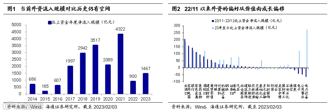 2022年11月以来外资情绪明显修复,流入板块结构从价值向成长偏移。2022年在地缘政治、海外央行紧缩、疫情扰动等因素的影响下,前10月A股外资仍处于累计净流出的水平,2022年1-10月外资流入规模创下了历史同期的最低水平。而22/11以来随着我国政策调整和人民币持续升值,外资开始大幅流入,2023年1月净流入规模更是达到了1400亿元,创下了单月历史新高,2022/11以来(截至2023/02/03,下同)外资累计净流入A股规模接近2500亿元。从结构来看,本轮外资大幅进场的过程中,2022年11-12月期间外资大幅流入消费和金融板块,买入额较大的有白酒、家电、银行、保险等行业;但2023年以来外资对成长板块的偏好开始明显提升,其中电力设备、电子、汽车等行业的外资净流入规模较大。
