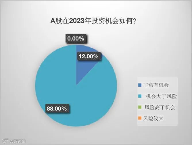 对于2023年的A股机会,保险投资官的看法明显较上一年更加乐观,并呈现较高一致性。在25位受访的保险投资官中,有3位认为2023年A股“非常有机会”,占比12%;22位认为“机会大于风险”,占比88%。