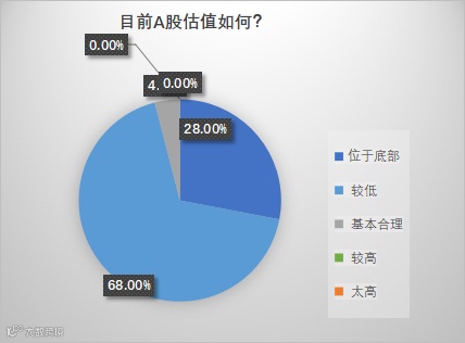 对于当前A股的估值水平,25位参与调查的保险投资官中,有17位认为“较低”,占比68%;有7位认为“位于底部”,占比28%;仅1位认为“基本合理”。
