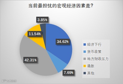本次调查显示,有42.31%的保险投资官最忧心地方财政压力,另有34.62%的保险投资官最顾虑经济下行。与此同时,有个别投资官提到,2023年最让他们担心的国内宏观经济因素是通胀,或者货币政策。