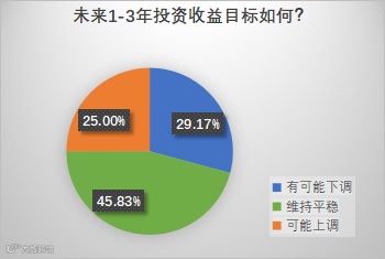 对于未来1~3年的投资收益目标,2023年中国保险投资官调查显示,45.83%的保险投资官选择“维持平稳”,25%的保险投资官则表示可能上调投资收益目标,另有29.17%的保险投资官选择“有可能下调”。