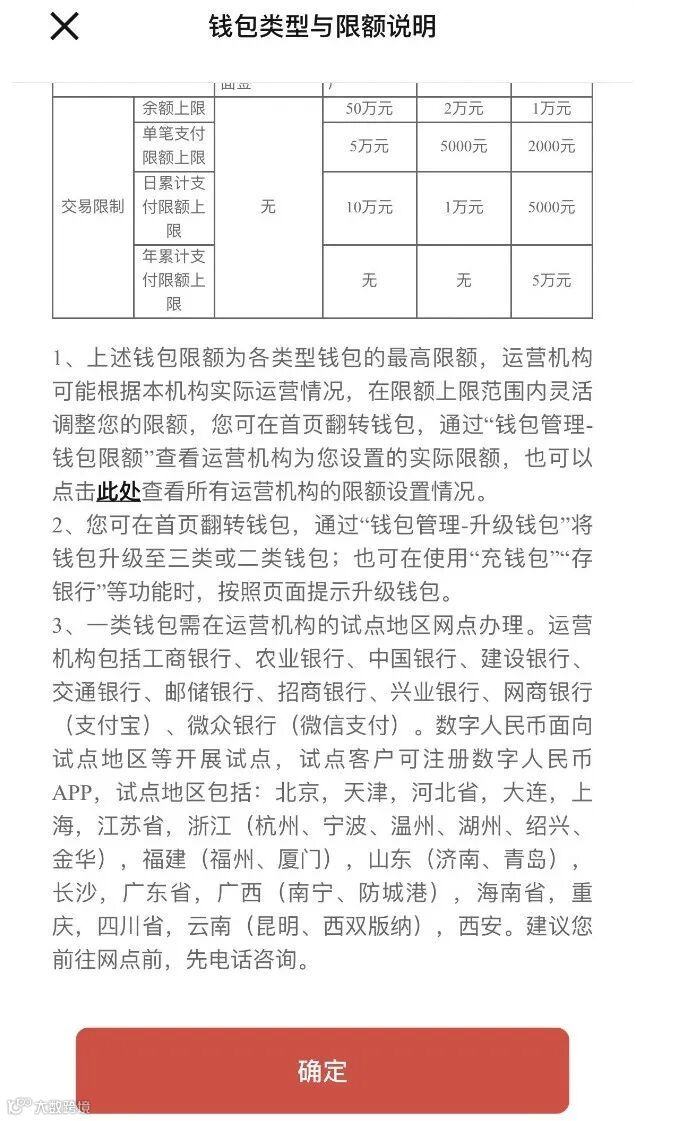 记者查阅数字人民币APP发现,在“钱包类型与限额说明”类目中明确标示试点范围扩大。现有试点地区包括:北京、天津、河北省、大连、上海、江苏省、浙江(杭州、宁波、温州、湖州、绍兴、金华)、福建(福州、厦门)、山东(济南、青岛)、长沙、广东省、广西(南宁、防城港)、海南省、重庆、四川省、云南(昆明、西双版纳)、西安。
