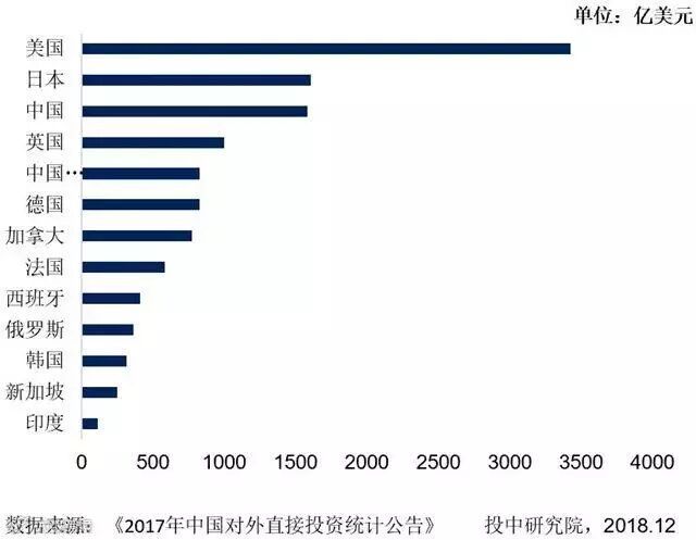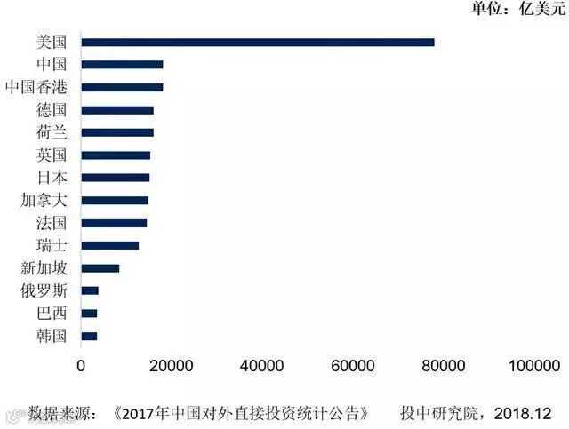 2017年末,中国对外直接投资存量18090.4亿美元,较上年末增加4516.5亿美元,是2002年末存量的60.5倍,占全球外国直接投资流出存量的份额由2002年的0.4%提升至5.9%,排名由第25位上升至第2位,仅次于美国(7.8万亿美元)。从存量规模上看,中国与美国差距较大,仅相当于美国的23.2%;与位列前六的中国香港、德国、荷兰、英国比较接近。