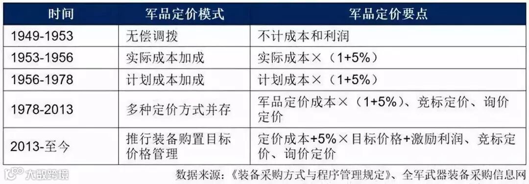 2013年9月总装备综合计划部发布《装备购置目标价格论证、过程成本监控和激励约束定价工作指南(试行)》,规定新立项的型号研制生产项目应由军方论证目标价格,批产后价格按照“定价成本+5%×目标价格+激励约束利润”来定采购价格,标志着新一轮军品定价机制改革的启动。