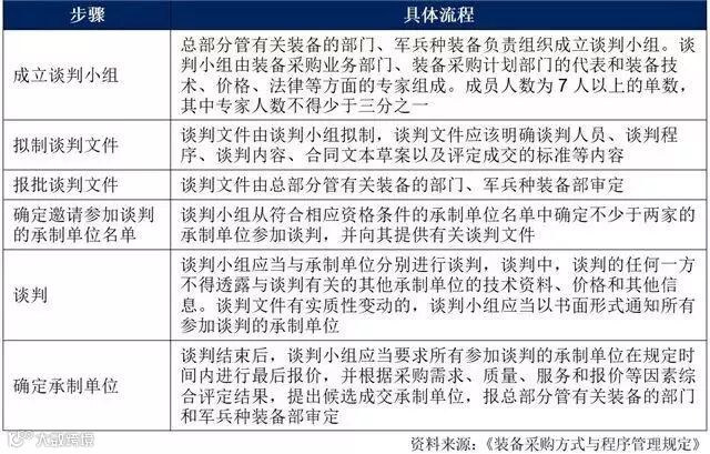 2003年,总装备部发布了《装备采购方式与程序管理规定》,明确了“公开招标采购、邀请招标采购、竞争性谈判采购、单一来源采购、询价采购”多种采购方式。2009年,总装备部发布了《关于加强竞争性装备采购工作的意见》,积极适应社会主义市场经济和装备发展要求,加快建立完善以竞争为核心的竞争、评价、监督、激励机制,不断提高装备质量和采购效益,促进装备建设又好又快发展。2014年7月26日,总装备部发布《竞争性装备采购管理规定》,规定了对公开招标、邀请招标、竞争性谈判、询价、评审确认等竞争性采购方式的实施方法。