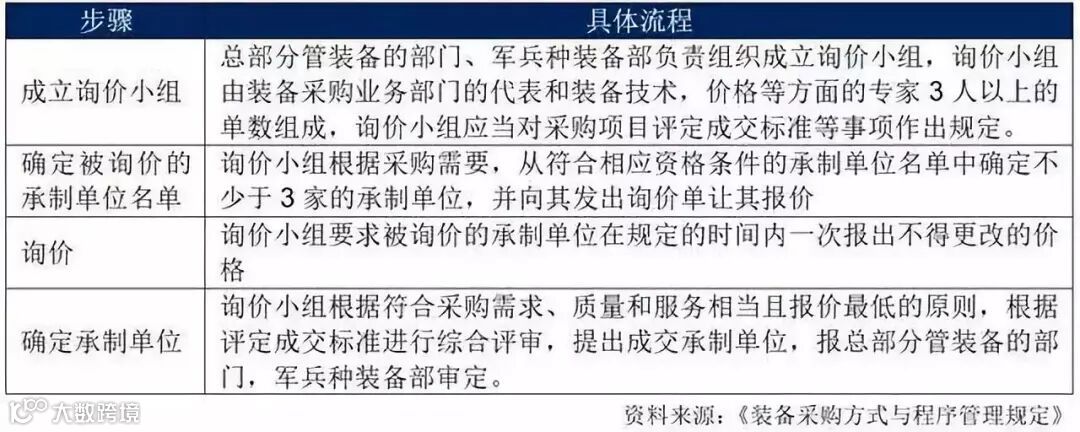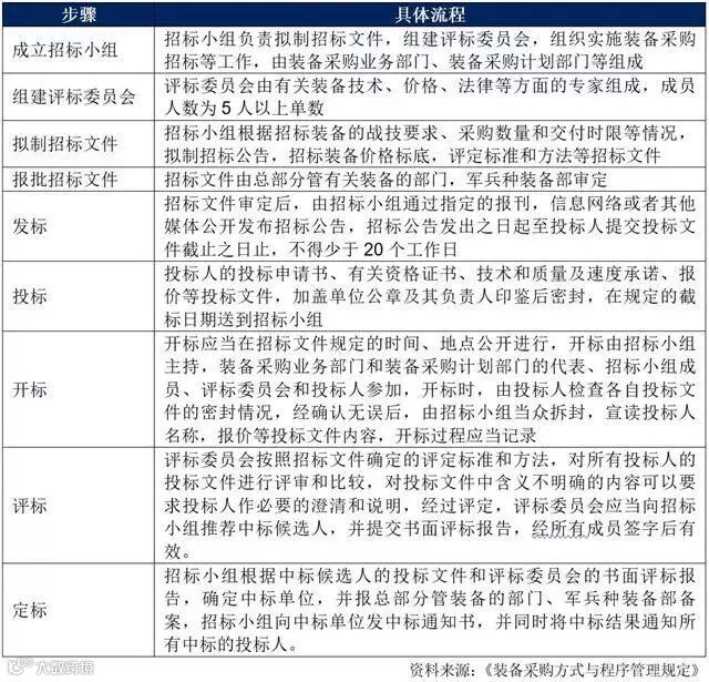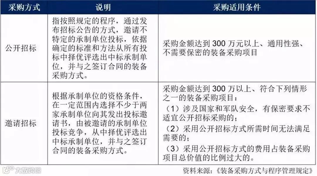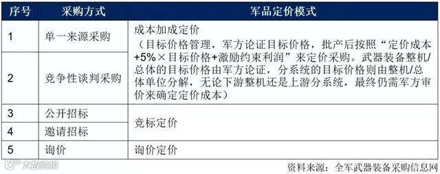 “公开招标”、“邀请招标”均采用“竞标定价”方式,军方制定价格标底,不对投标企业进行审价。从全军武器装备采购信息网来看,公开招标和邀请招标一般用于采购较为成熟的产品。