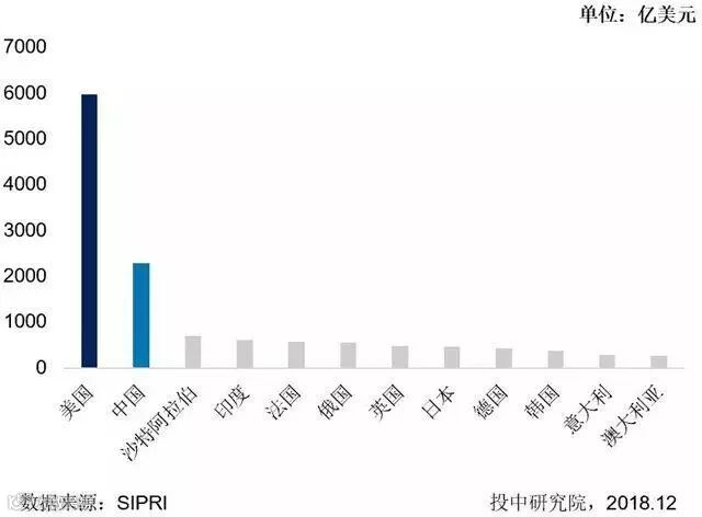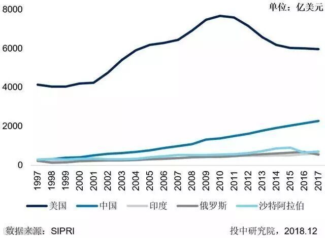 图2:全球军费开支排名前五国家(按2016年不变汇率计算)