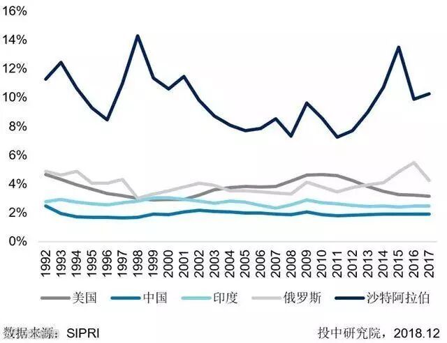 从全球主要军事国家2017年军费开支占GDP情况来看,美国军费总量居世界第一,军费占GDP比例长期维持在3%-5%;中国军费总量居世界第二,军费占GDP比例却长期低于2%,与世界其他军事国家差距明显;沙特阿拉伯军费总量居世界第三,军费占GDP比例达到7%-14%水平,一方面源于沙特阿拉伯极端落后的军工产业使其极度依赖武器进口,另一方面由于中东长期动乱的局势加强了其国防需求;印度军费总量居世界第四,军费占GDP比例维持在2%-3%;俄罗斯军费总量略低于法国,居世界第六,但军费占GDP比例维持在3%-6%,近年来受经济形势和地缘冲突等多方面影响,占比呈上涨趋势。