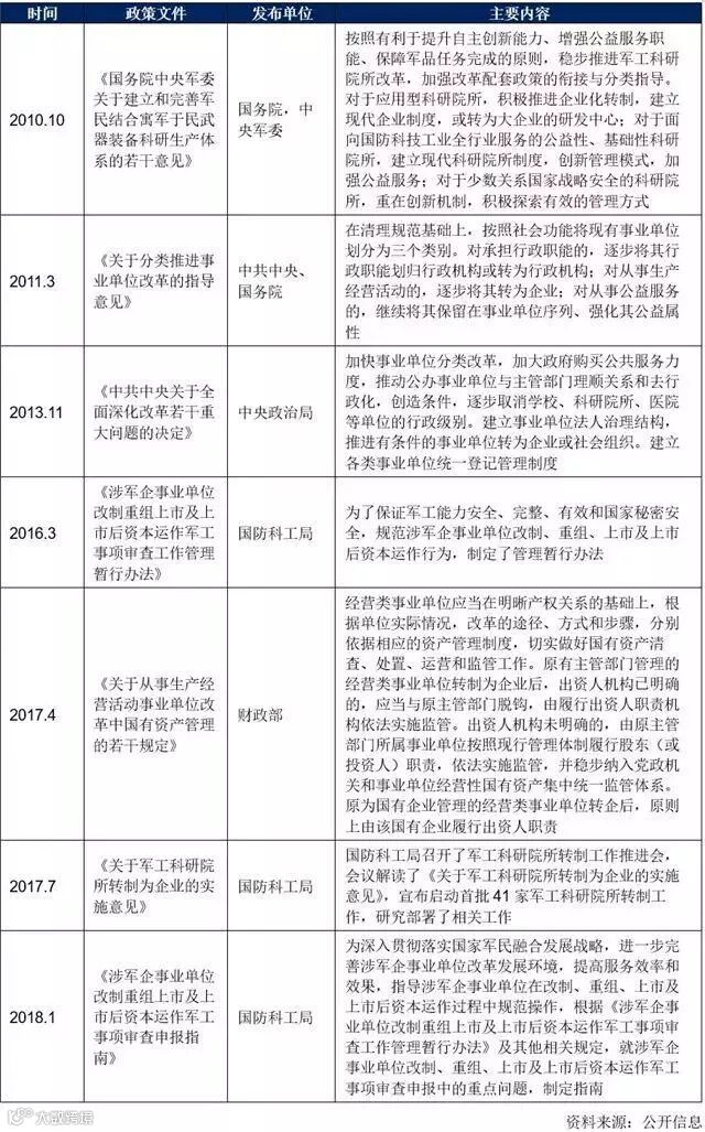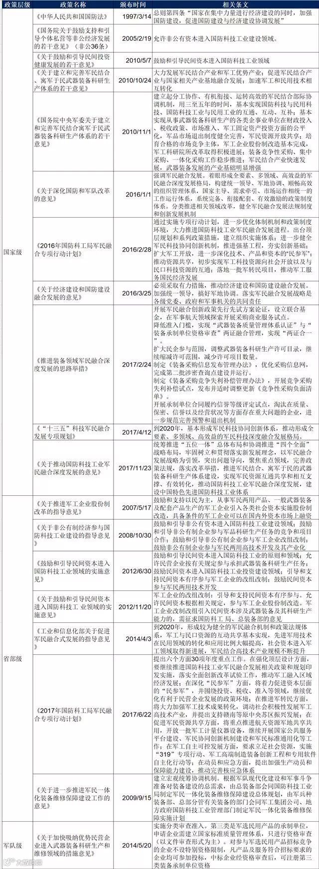2017年12月4日国务院办公厅印发《关于推动国防科技工业军民融合深度发展的意见》(以下简称《意见》),《意见》指出国防科技工业是军民融合发展的重点领域,是实施军民融合发展战略的重要组成部分,对提升中国特色先进国防科技工业水平、支撑国防军队建设、推动科学技术进步、服务经济社会发展具有重要意义。当前和今后一个时期是军民融合发展的战略机遇期,也是军民融合由初步融合向深度融合过渡、进而实现跨越发展的关键期,国防科技工业领域军民融合潜力巨大。《意见》从七个方面提出了推动国防科技工业军民融合深度发展的具体政策措施,其中明确指出要积极引入社会资本参与军工企业股份制改造,修订军工企业股份制改造分类指导目录,科学划分军工企业国有独资、国有绝对控股、国有相对控股、国有参股等控制类别,除战略武器等特殊领域外,在确保安全保密的前提下,支持符合要求的各类投资主体参与军工企业股份制改造。按照完善治理、强化激励、突出主业、提高效率的要求,积极稳妥推动军工企业混合所有制改革,鼓励符合条件的军工企业上市或将军工资产注入上市公司,建立军工独立董事制度,探索建立国家特殊管理股制度,充分发挥国有企业混合所有制改革试点示范带动作用,及时推广相关经验。该《意见》发布,表明这是我国推进军民融合深度发展的重要举措,也是推动国防科技工业军民融合深度发展的顶层设计和行动纲领。
