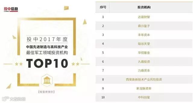 图10:投中2017年度最佳军工领域投资机构TOP10榜单
