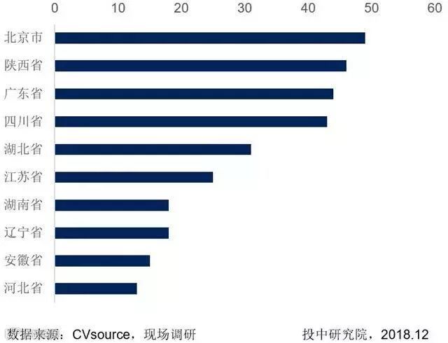 图12:2014-2018Q3获得融资军工企业标的地域分布TOP10