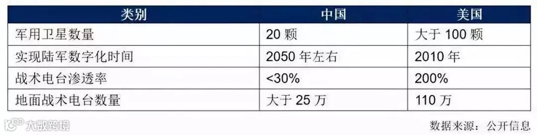 作战信息化领域方面,则参照美国在海湾战争后于1995年和1997年出台《美国陆军数字化总纲》和《下世纪后陆军计划》的步伐,目标在于建立战场单元的网络连接,实现整个作战空间的信息收集和交换。具体的投资领域包括智能化传感器、显示技术和保密通信技术,最终目标是开发数字一体化的指挥控制系统和跨战区联合作战指挥系统。以通信技术为例,目前美国及北约军事卫星承担军用通信近85%的通信量,我国则不足5%。我国在2000年左右才真正开始军用通信卫星建设,中星22号卫星目前已经服役超过10年仍在工作,不仅通信带宽和接入能力落后,更不具备抗干扰能力,卫星通信能力不足的瓶颈严重影响了我国的国防安全,因此作战信息化同样是我国民参军需要重点投资的领域。