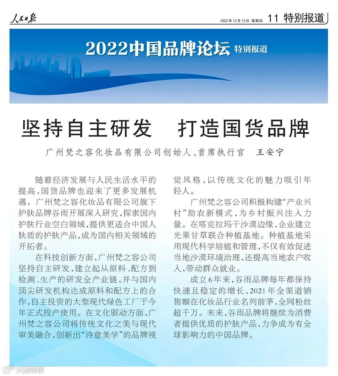 近日,由人民日报社主办的2022中国品牌论坛在北京隆重举行。本次论坛以“推动中国品牌建设高质量发展”为主题,政府主管部门代表、企业负责人、专家学者齐聚一堂,开展了深入研讨交流。谷雨品牌创始人&首席执行官王安宁亦受邀参加此次论坛。作为唯一一个受邀参与论坛的国货护肤品牌,谷雨(母公司“广州梵之容化妆品有限公司”)凭借在科技与文化上的双创新,荣获“2022年度中国品牌创新案例奖”。
