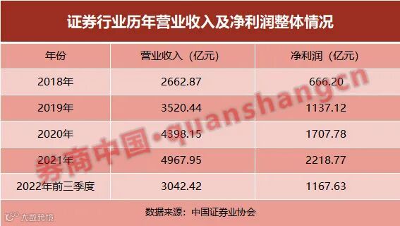 2018年以来,证券行业整体保持营收、净利逐年双增的趋势,截至2021年证券行业全年实现营业收入4967.95亿元,实现净利润2218.77亿元。不过,在业绩持续增长4年以后,券业业绩持续改善的势头在2022年戛然而止。