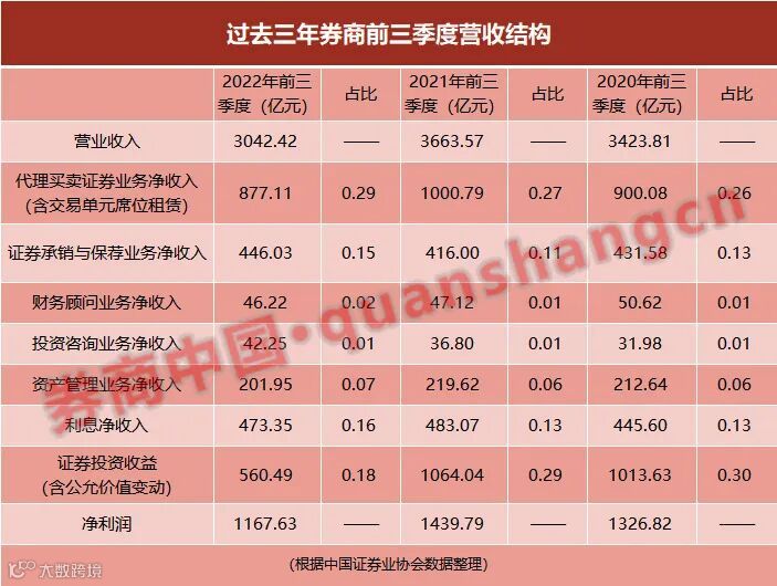 中国证券业协会披露的数据显示,2022年前三季度,140家证券公司实现营业收入3042.42亿元,净利润1167.63亿元,分别同比去年下滑16.95%及18.90%。Choice数据显示,42家上市券商中,仅2家券商今年前三季度归母净利润实现同比增长。