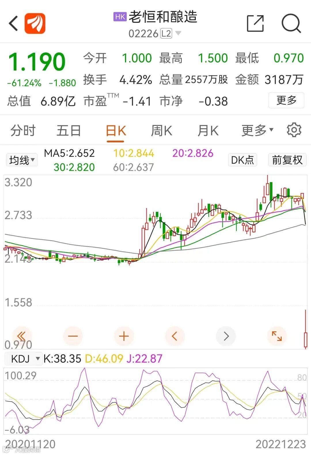 百年老字号老恒和酿造港股在停牌21个月后,今日复牌交易,开盘一度低开近70%,后虽有所反弹,截至收盘,跌幅仍高达逾60%,成交急剧放大至停牌前的20倍以上。