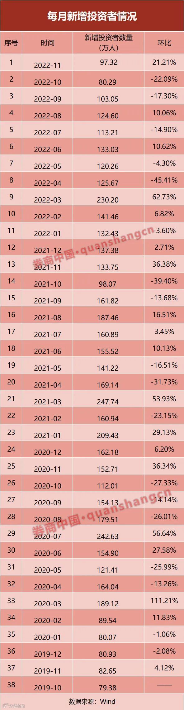 除了股市上涨行情的影响外,记者注意到,每年11月的新增投资者数量似乎都在环比大幅增长。去年11月新增投资者数量环比增长36.38%,2020年11月的数据环比增长36.34%,2019年11月环比增长4.12%,2018年11月环比增长15.4%,2017年11月环比增长27%,2016年11月环比增33.6%,2015年11月环比增长37%。