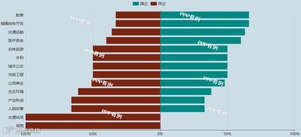 2018年10月,国有企业重点参与行业有教育、城镇综合开发、交通运输;民营企业重点参与的为场馆、交通站场、人居改善等行业。国有企业与民营企业在各行业成交项目数量占比情况如下图: