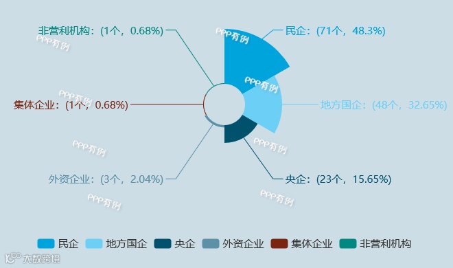 2018年10月,共有147家社会资本参与PPP市场,其中民营企业数量达71家,占比48%;地方国企和央企分别为48家、23家;集体企业、事业单位、非营利机构与外资企业占比相对较少。