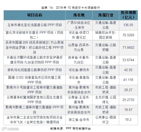 从成交项目投资规模情况来看,2018年10月,交通运输行业以357亿元的成交金额,占据了行业成交榜的首位,其次为市政工程和城镇综合开发。