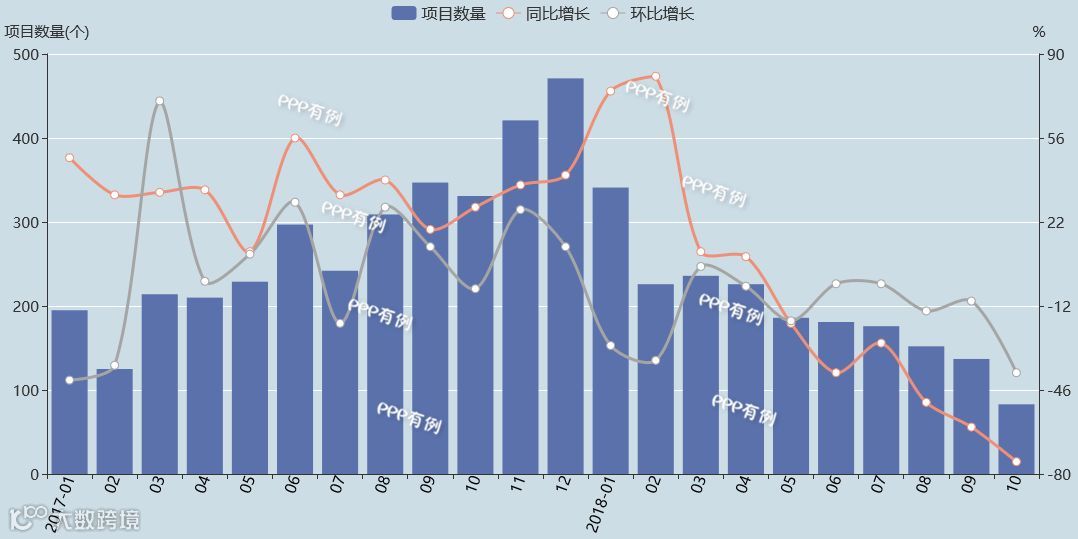 从成交总量分布来看,2018年10月,全国全行业PPP项目总体成交量为83个,同比减少75%,环比减少39%。