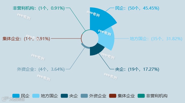 2018年10月,PPP市场成交项目情况,民营企业以45%的占比,位居第一;地方国企与央企,分别占比32%、17%;集体企业、事业单位与外资企业占比相对较少。