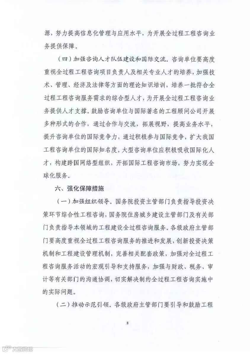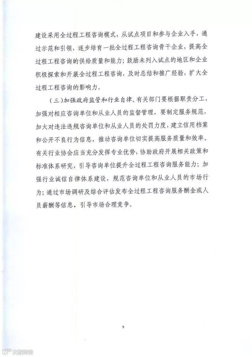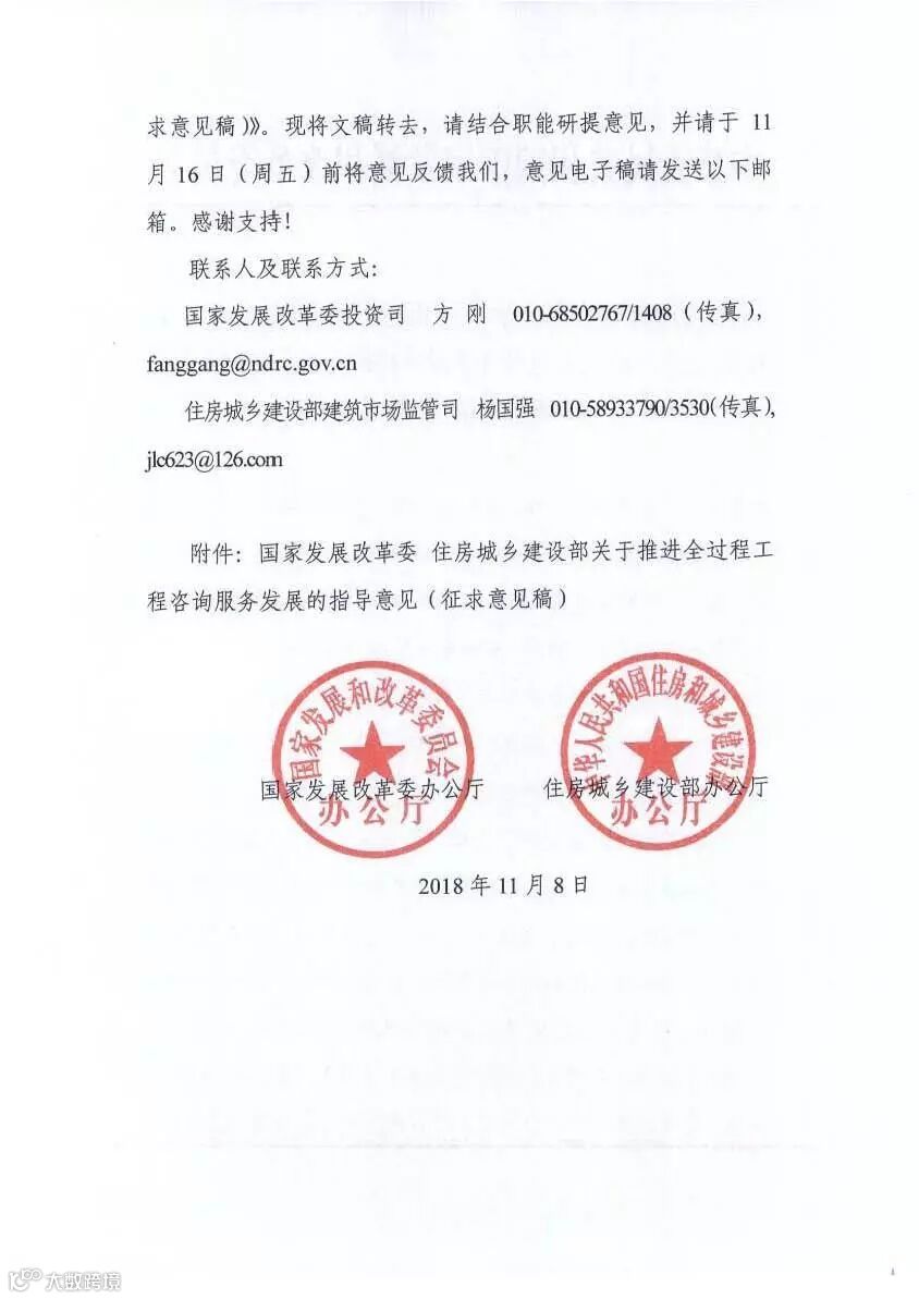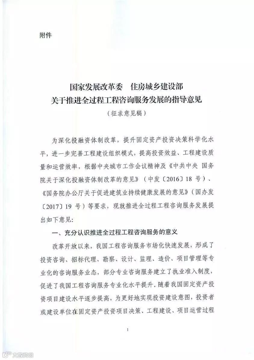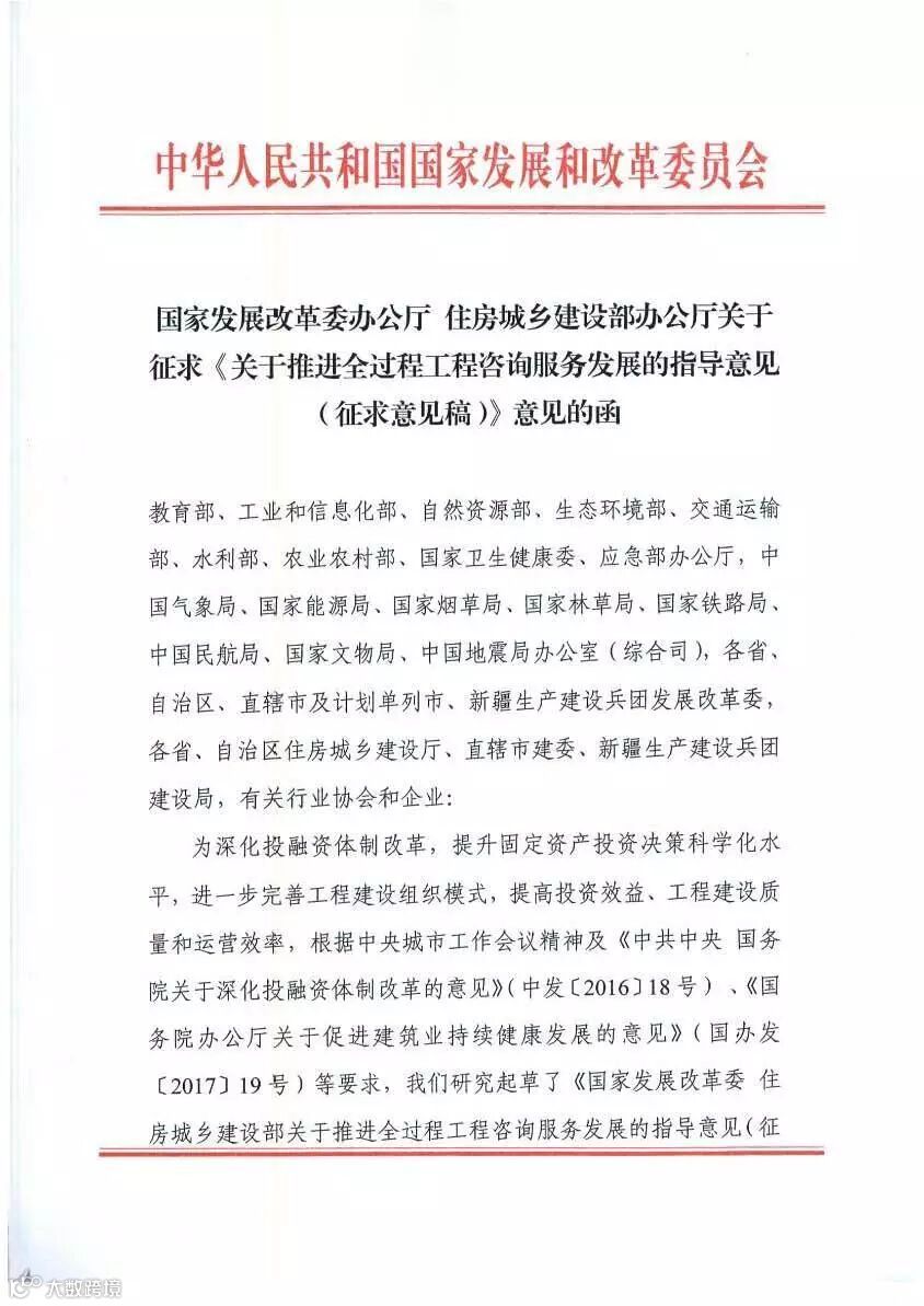 为深化投融资体制改革,提升固定资产投资决策科学化水平,进一步完善工程建设组织模式,提高投资效益、工程建设质量和运营效率,根据中央城市工作会议精神及《中共中央国务院关于深化投融资体制改革的意见》(中发[2016]18号)、《国务院办公厅关于促进建筑业持续健康发展的意见》(国办发[2017) 19号)等要求,国家发改委办公厅和住建部办公厅研究起草了《关于推进全过程工程咨询服务发展的指导意见(征求意见稿)》。