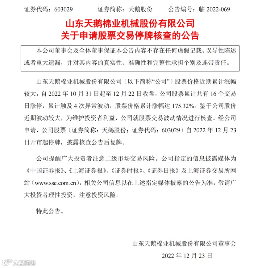 12月22日晚,天鹅股份公告,自2022年10月31日起至12月22日收盘,公司股票累计共有16个交易日涨停,累计触及4次异常波动,股票价格累计涨幅达175.32%,股票停牌核查。就在当天,天鹅股份股价再次涨停!