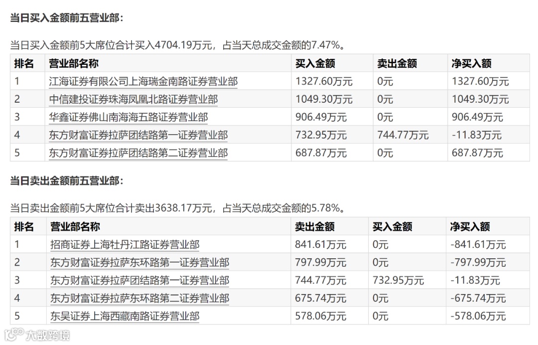 具体来看,江海证券有限公司上海瑞金南路证券营业部、中信建投证券珠海凤凰北路证券营业部分别买入1327.60万元、1049.30万元;招商证券上海牡丹江路证券营业部、东方财富证券拉萨东环路第一证券营业部分别卖出841.61万元、797.99万元。