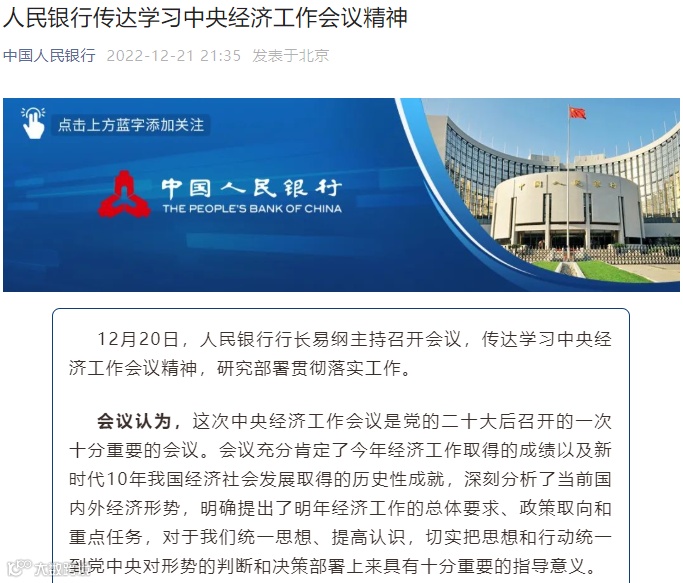 12月21日,人民银行发布消息称,人民银行行长易纲20日主持召开会议,传达学习中央经济工作会议精神,研究部署贯彻落实工作。